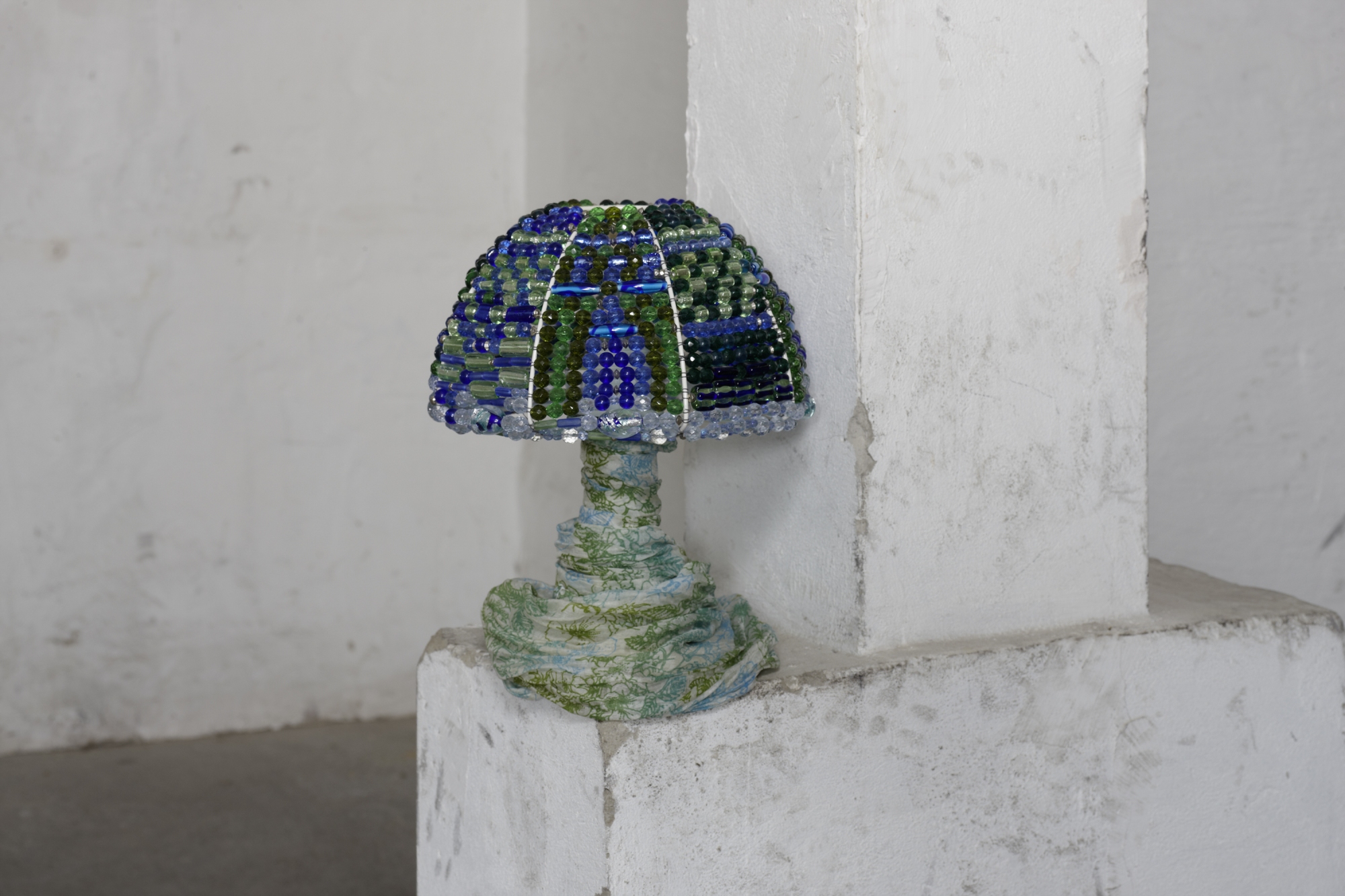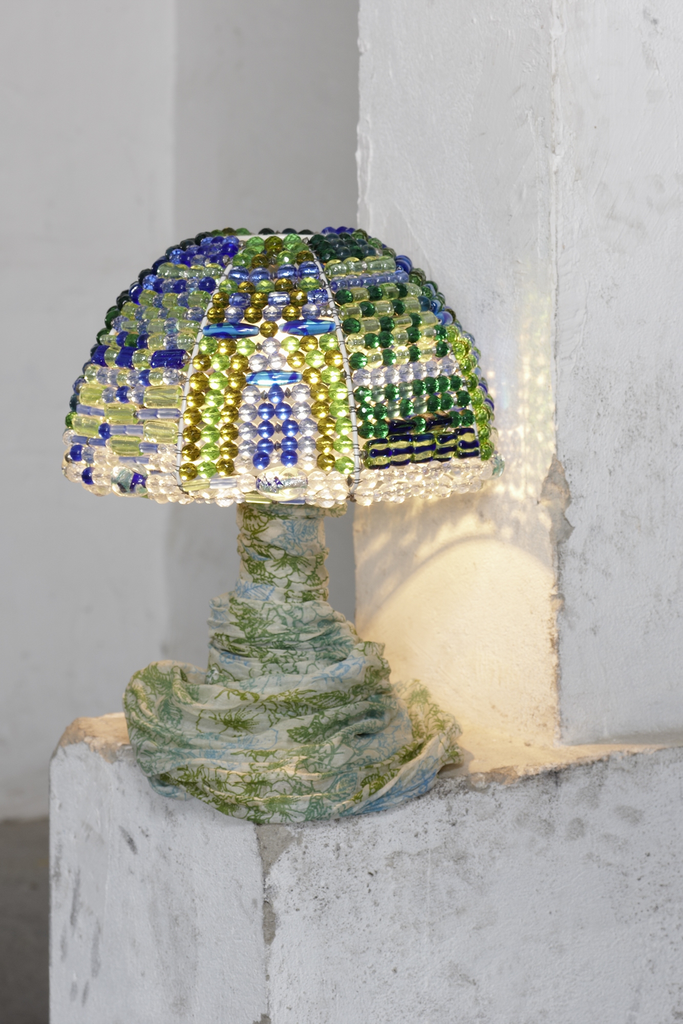 Der Name der Lampe weckt Assoziationen an den Erlkönig, der in dem gleichnamigen Gedicht von Goethe das spannende Unheimliche und zugleich Verführerische der Sturm- und Drangepoche symbolisiert. Warme Gelb-grün-Töne stehen im Kontrast zu frischen blauen und klaren Farben, das kühle Glas und die logische Anordnung der Perlen im Gegensatz zu ihrer Unebenheit und Formenvielfalt. Mit dem Bauch nach unten macht sich dieser Lampenschirm auch als Hängeleuchte sehr schön.